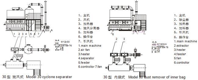 Fluidizing dryer is also called fluid bed. Through operation and improvement over 30 years, it has play an active part in the fields of pharmaceutical, chemical, foodstuff, gain and so on industries. It consists of air filter, fluid bed, cyclone separator, dust collector, high-speed centrifugal fan, control cabinet and so on. Because of the difference of property from raw material, it is necessary to equip dust remover in accordance with practical needs. It may select cyclone separator and dust collector both or one of them. In general, cyclone separator can be selected if the raw material is larger and the dust collector may be selected if the raw material is light. Moreover, there is pneumatic feeding device for your selection. There are two kinds of operation for this machine, continuous and intermittent type.