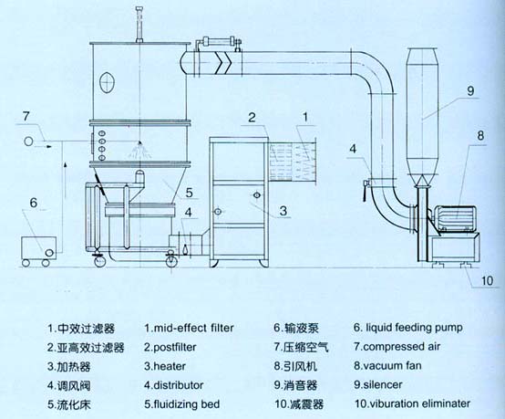 FL系列沸騰制粒干燥機接觸物料部分均用1Cr18Ni9Ti不銹鋼制造。制粒機熱能分蒸汽加熱和電加熱,控制部份分普通型和電腦型,任用戶選擇。